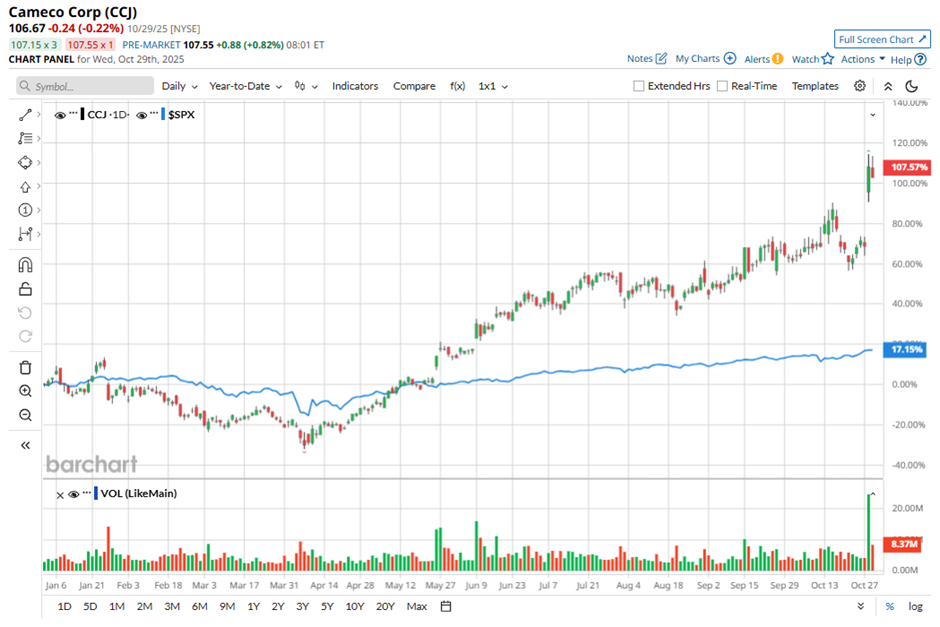 Over the past year, the nuclear energy stock has surged an eye-catching 79%, including an impressive 83% gain in 2025 alone. For a better perspective, the broader S&P 500 Index ($SPX) has climbed a modest 13% over the past year and 16% so far this year, making Cameco’s rally stand out even more.