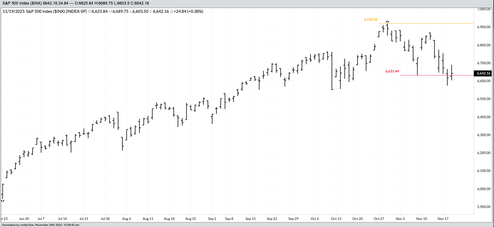 It has been an interesting week for the S&P 500 index (($INX). After posting a new all-time high of 6,920.34 the last week of October, the Index has fallen to a low of 6,574.32 this week (Tuesday, October 18), a drop of 346.02 (5%). While still a long way from the 20% level that marks a “bear” market, from a technical point of view, the Index took out its previous 4-week low of 6,631.44 from the week of October 3.