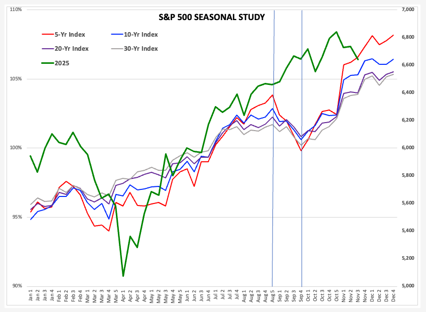 With November nearing its end, what should we expect from the Index based on seasonal analysis? The 5-year, 10-year, 20-year, and 30-year patterns all show the Index tends to continue to firm during December.