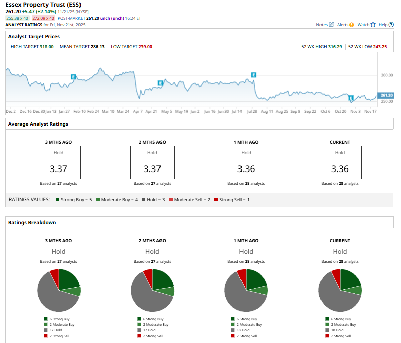 Among the 28 Wall Street analysts covering Essex Property Trust’s stock, the consensus is a “Hold.” That’s based on six “Strong Buy” ratings, two “Moderate Buys,” 18 “Hold” ratings, and two “Strong Sell” ratings.