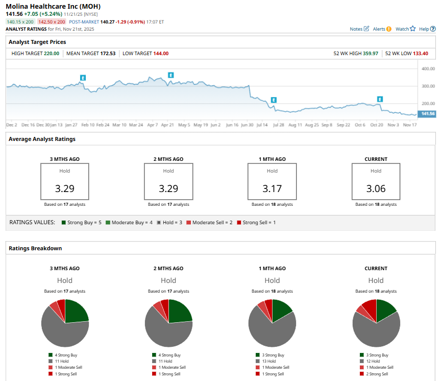 Overall, Wall Street appears cautious about MOH stock, with a consensus “Hold” rating. Of the 18 analysts currently offering recommendations, three advise a “Strong Buy,” 12 give a “Hold,” one has a “Moderate Sell” rating, and the remaining two have a “Strong Sell” rating.
