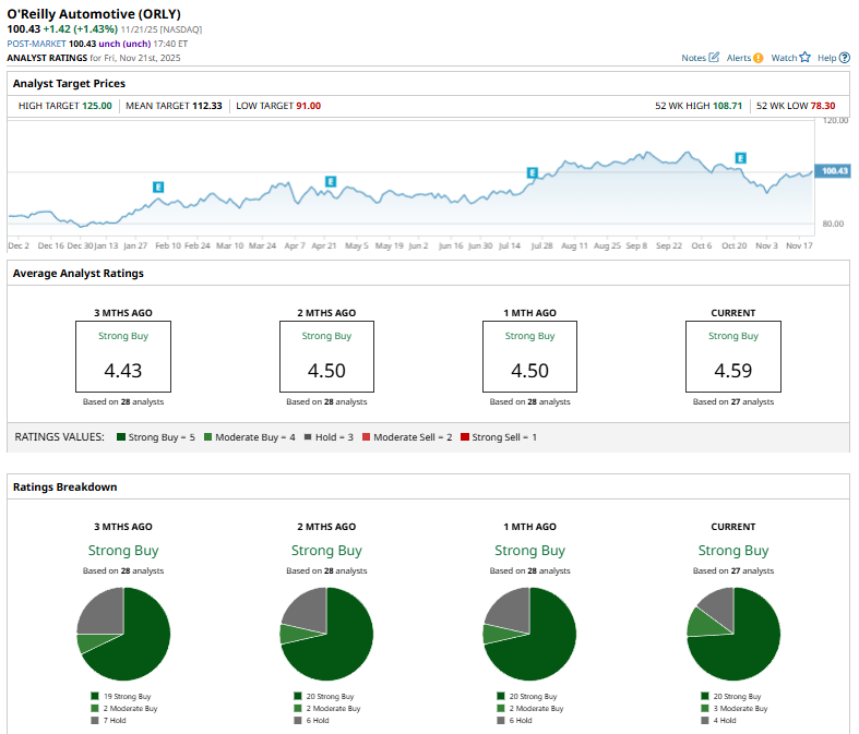 Among the 27 Wall Street analysts covering O’Reilly’s stock, the consensus is a “Strong Buy.” That’s based on 20 “Strong Buy” ratings, three “Moderate Buys,” and four “Hold” ratings.