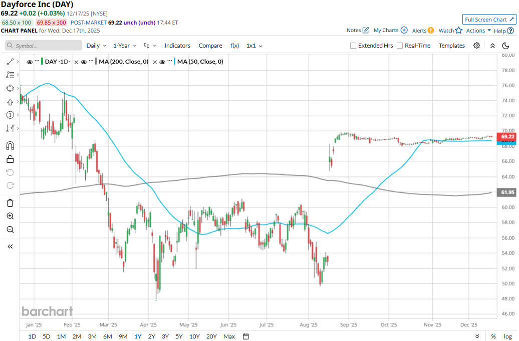 Meanwhile, Dayforce has notably outperformed its peer, Workday, Inc.’s (WDAY) 16.3% decline in 2025 and 22.3% plunge over the past 52 weeks.