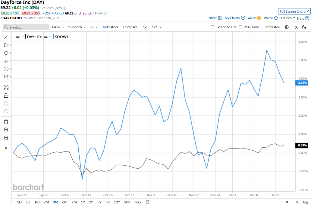 Dayforce touched its 52-week high of $77.52 on Dec. 17, 2024, and is currently trading 10.7% below that peak. Meanwhile, DAY stock prices have inched up 1.2% over the past three months, underperforming the Dow Jones Industrial Average’s ($DOWI) 4.1% gains during the same time frame.