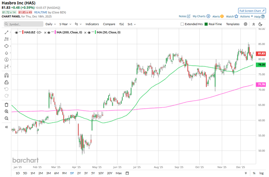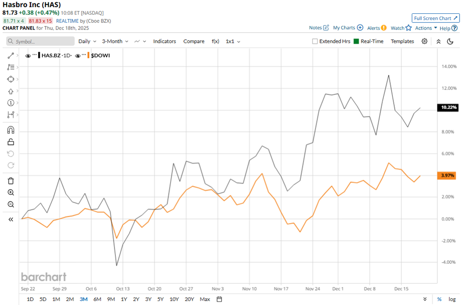Shares of the toy and game maker have slipped 3.8% from its 52-week high of $85.14. HAS stock has gained 9.4% over the past three months, outpacing the broader Dow Jones Industrials Average's ($DOWI) 4.4% rise over the same time frame.