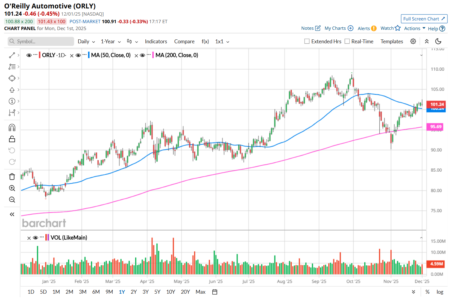 To confirm its bullish trend, ORLY has been trading above its 200-day moving average over the past year, with slight fluctuations, and has remained above its 50-day moving average since late November.