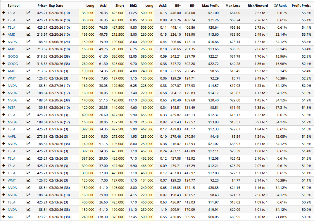 The screener shows some interesting long call butterfly trades on popular stocks such TSLA, AMD, NVDA, GOOG, WMT and PLTR.