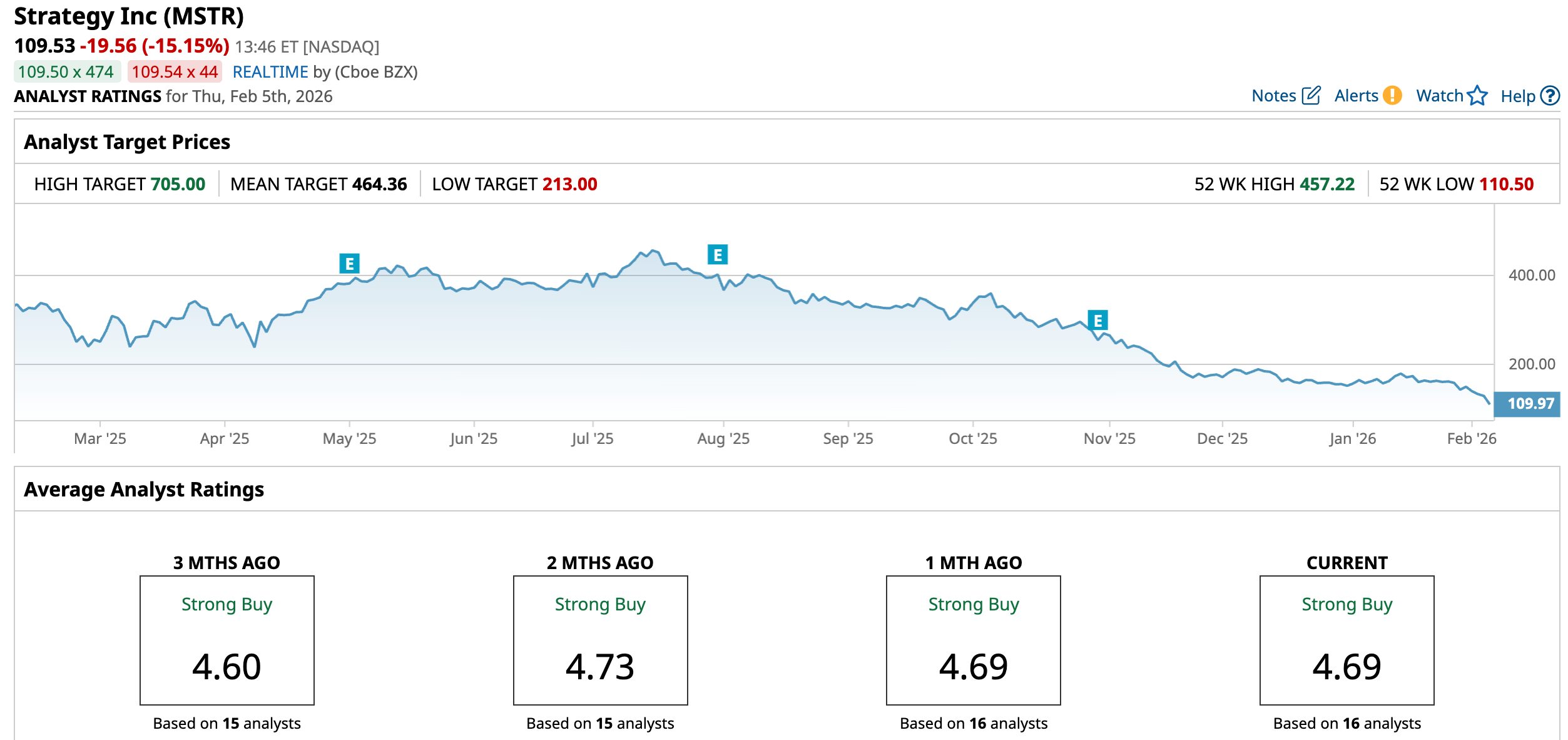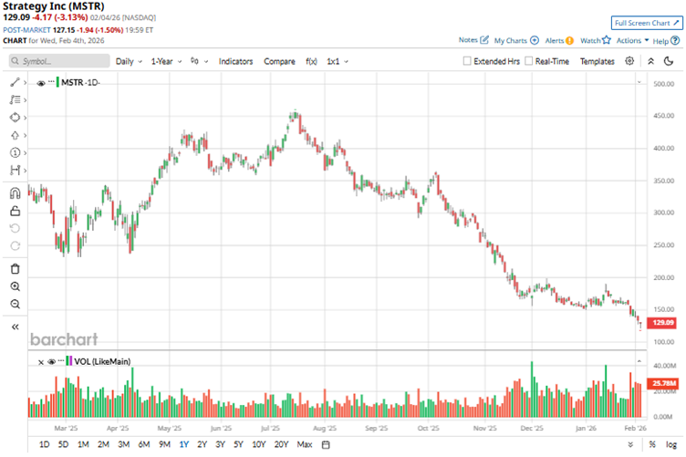 As Bitcoin goes through a pullback, MSTR’s stock has been in free-fall. Over the past 52 weeks, the stock has dropped 67.03%, while it is down 26.94% year-to-date (YTD). Strategy’s shares had reached a 52-week high of $457.22 in July 2025, but are down 71.8% from that level.