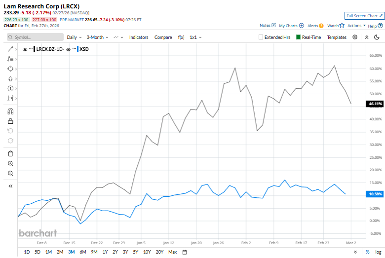 This tech giant is currently trading 8.9% below its 52-week high of $256.68, recorded recently on Feb. 25. Shares of LRCX have rallied 50.8% over the past three months, considerably outpacing the State Street SPDR S&P Semiconductor ETF (XSD), which has gained 11.1% in the same time frame.