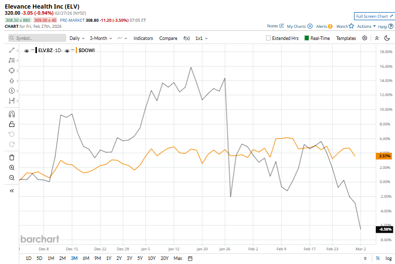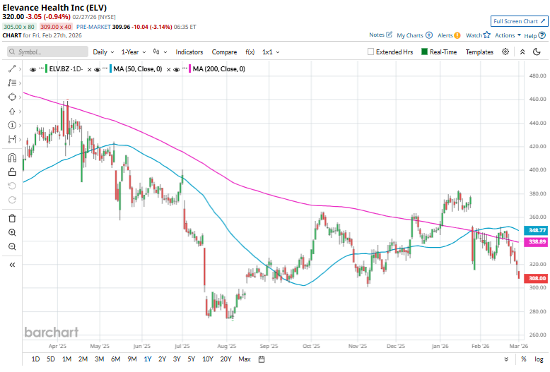 Elevance shares dipped below their 50-day and 200-day moving averages in late January, underscoring its bearish trend.