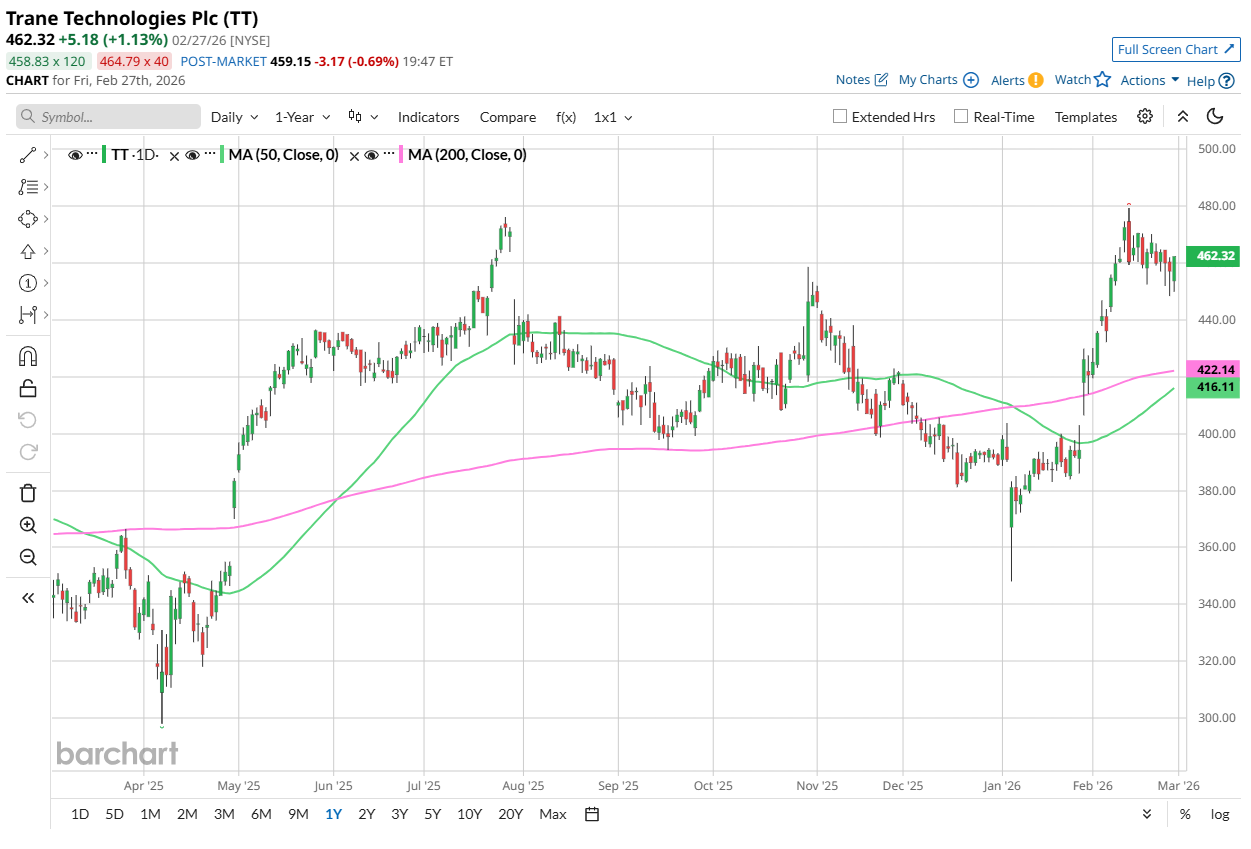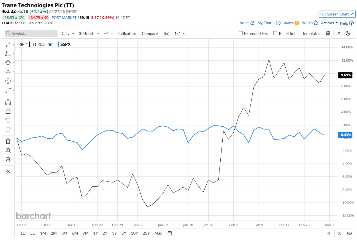 Trane’s shares currently trade 3.6% below their February high of $479.37, yet the broader trend remains constructive. Over the past three months, the stock has advanced 10.2%. During the same period, the S&P 500 Index ($SPX) posted only a marginal gain, highlighting Trane’s relative outperformance.