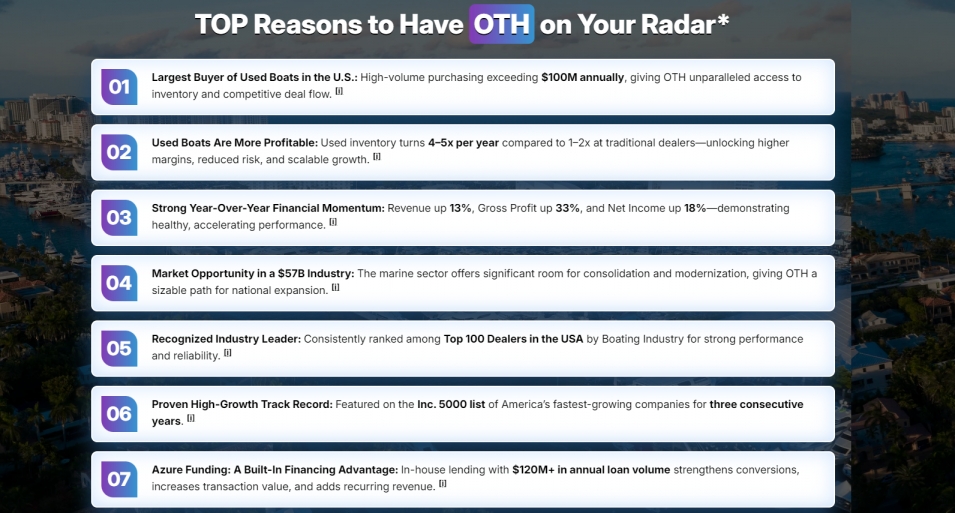 OTH has consistently earned recognition on the Inc. 500, ranked among the Top 100 Dealers in the USA. OTH continues advancing after its successful 2025 IPO, supported by strong technology adoption, expanding market reach, and participation in a U.S. marine industry valued at $57 billion.