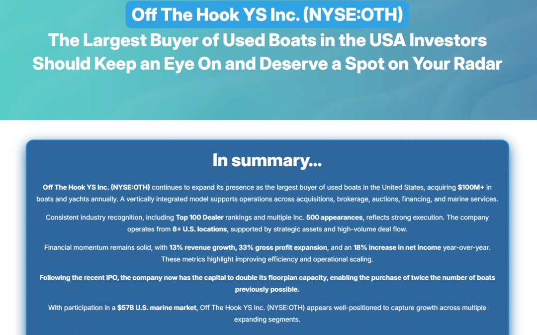 Off The Hook YS Inc. (NYSE American: OTH), Founded in 2012 by Jason Ruegg, has become one of America’s largest buyers and sellers of pre-owned boats. Headquartered in Wilmington, North Carolina, with operations throughout the East Coast and South Florida, OTH acquires more than $100 million in boats and yachts annually. OTH leverages AI-assisted valuation tools and a data-driven sales platform to bring speed and transparency to yacht transactions, supported by a nationwide network of offices and marinas offering brokerage, wholesale, and performance yacht sales.