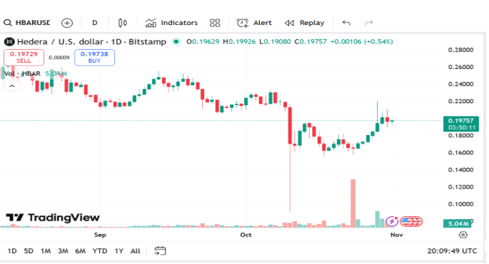 Technical efficiency and collaborations with an enterprise emphasis let Hedera (HBAR) keep up its speed. With a market capitalization of $8.18 billion and a trading volume of $460.58 million, HBAR is currently trading at $0.1973 and has a constant 24-hour change of 0%. This is a 37.34% fall as investors consolidate following recent network milestones.