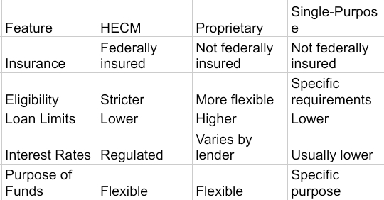 The following table summarizes the main types of reverse mortgages.