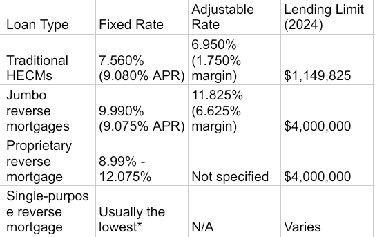 Interest rates are one of the most important factors when determining a reverse mortgage’s total cost. The following table summarizes typical rates for the different types of reverse mortgage loans: