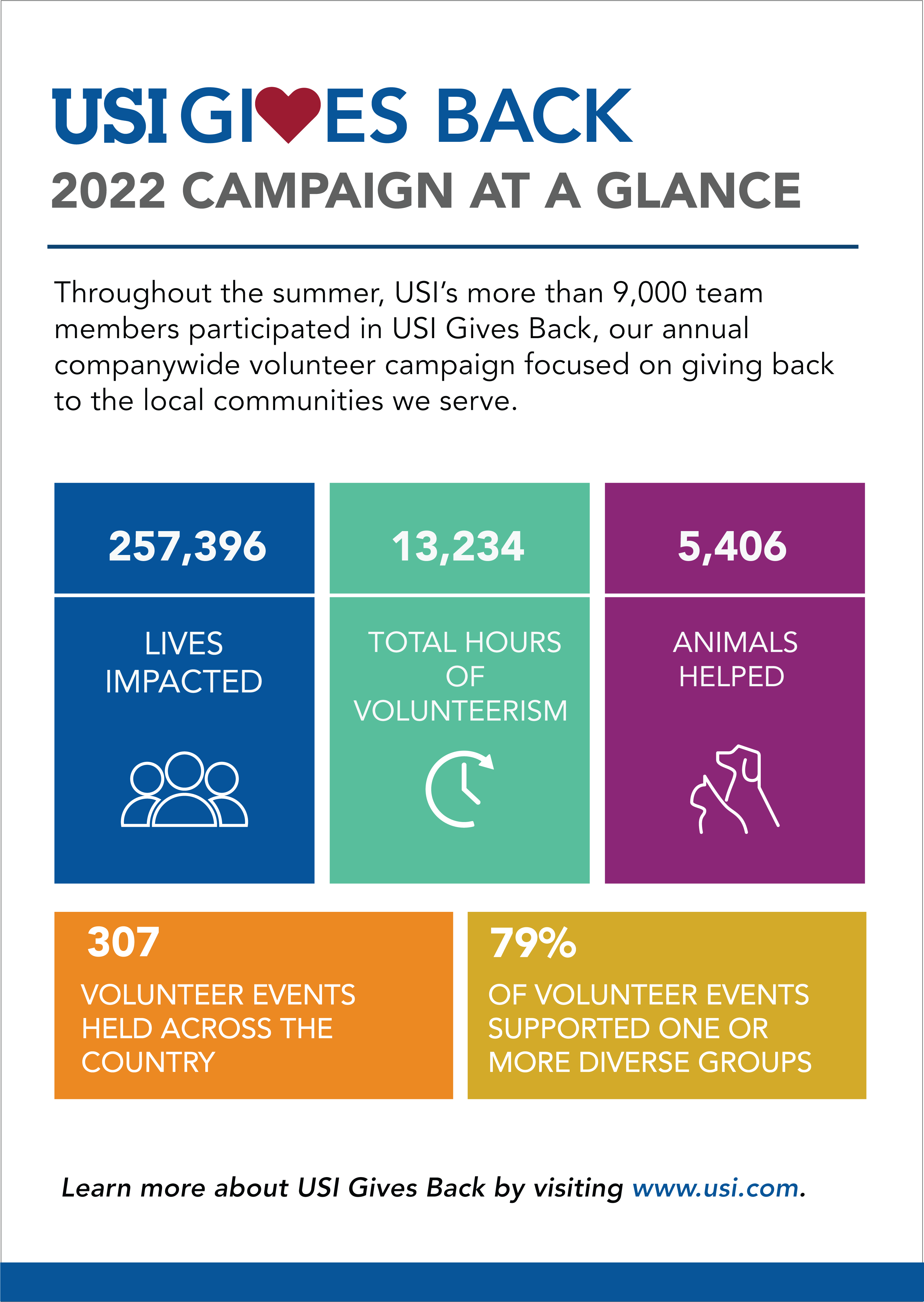 “Since the inception of our Gives Back program, USI team members have positively impacted over 2.5 million lives across the diverse communities that we serve,” added Michael Sicard, USI’s chairman and CEO. “I’d like to thank our more than 9,000 team members for actively embracing the spirit of this annual volunteer campaign and their passion for uplifting so many of our local communities in unique and meaningful ways.”