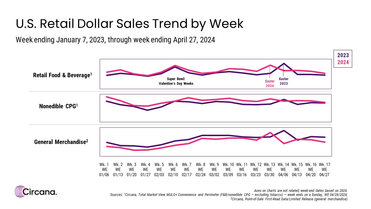 CHICAGO, May 13, 2024 (GLOBE NEWSWIRE) -- In April 2024, U.S. retail sales revenue, including both discretionary general merchandise and consumer packaged goods (CPG), declined 1% compared to the same month last year. During this period, spanning the four weeks ending April 27, 2024, year-over-year unit demand declined 2% across retail segments. While overall consumer spending levels at retail are holding relatively steady to recent trends, what consumers are spending on is changing, according to Circana™, the leading advisor on the complexity of consumer behavior.