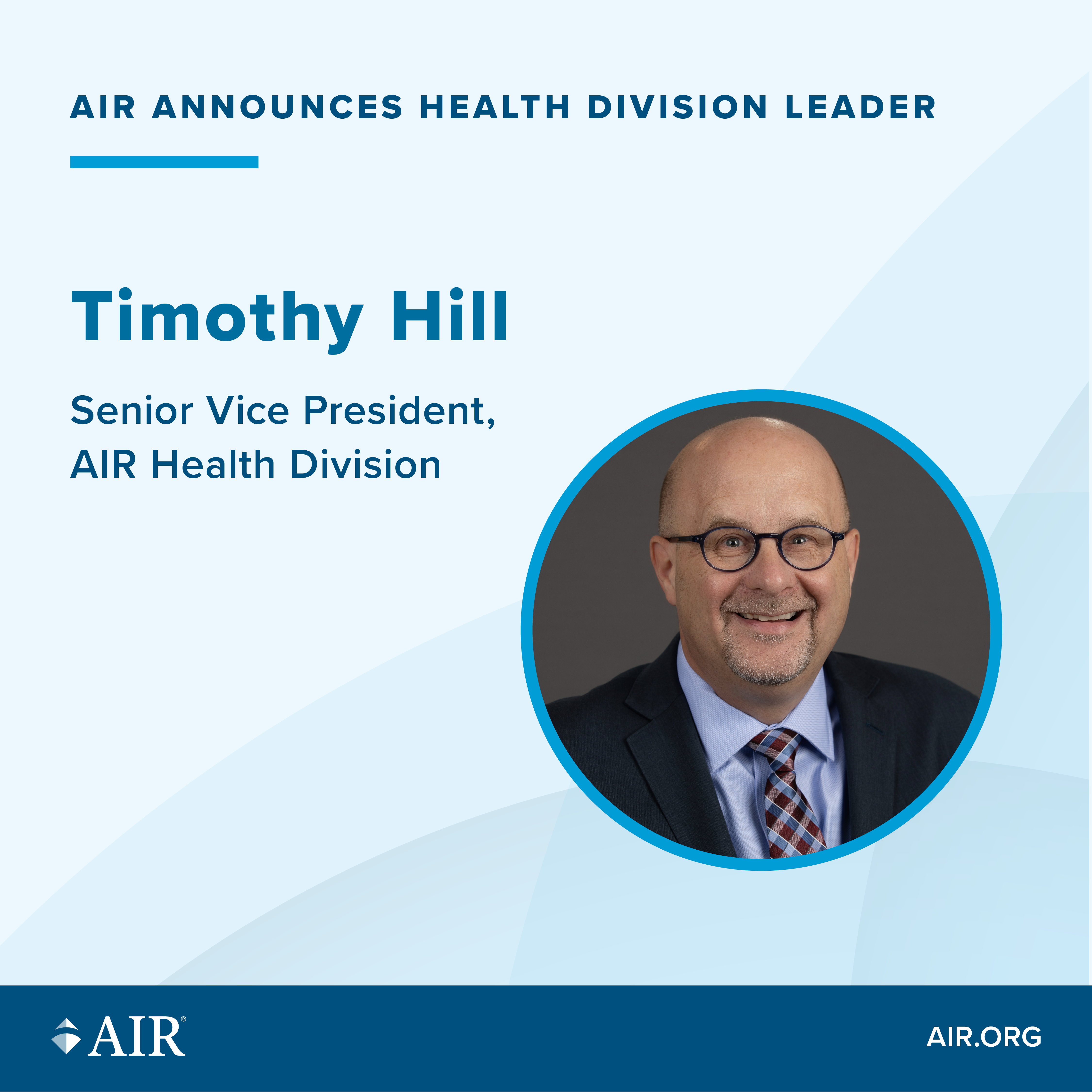 "Health access and equity are key areas where AIR’s research and technical expertise is making a real difference in people’s lives,” AIR President and CEO Jessica Heppen said. “Tim Hill has the experience and knowledge of health policy to ensure our work continues to be relevant, impactful, and mission focused. I’m grateful to have him on the team."